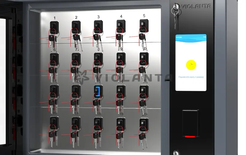 Каждый слот для фиксации ключа оборудован блокировкой и светодиодом обозначающим доступ к ключу разрешен/запрещен (красный/зеленый)